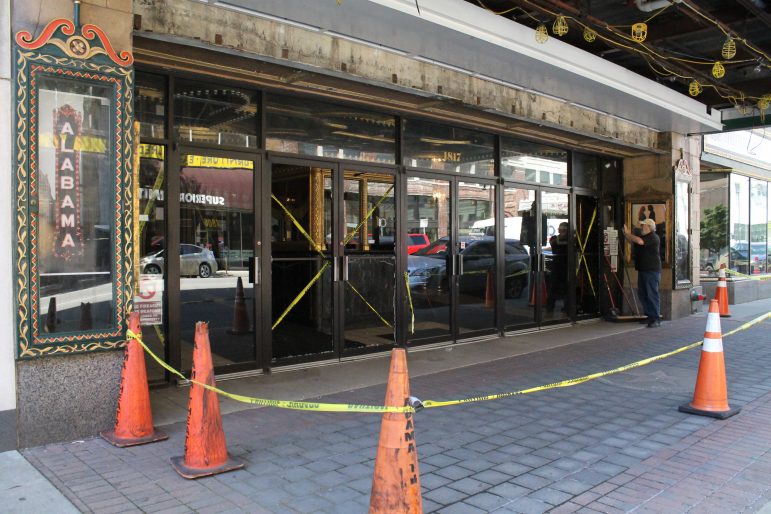 Protestors shattered glass doors at the entrance to the Alabama Theater.