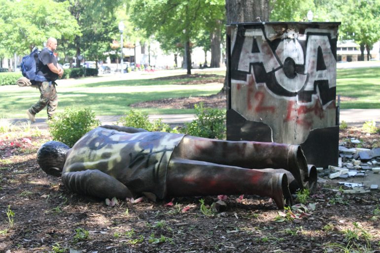 Protestors tore down a statue and defaced several others Sunday evening in Linn Park.