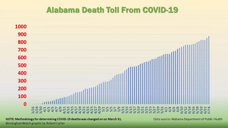The number of deaths attributed to COVID-19 has started to rise again, and the seven-day moving average has more than doubled from a week ago. The ADPH reported 95 deaths in the previous week, compared to 45 in the seven days ending June 17.