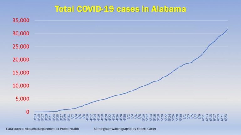 In the latest ADPH chart on the positivity rate, 10.9% of those tested from June 14 to June 20 are shown positive. However, for the past seven days, the state had 4,710 total positives among those tested, for a rate of 9.81%, according to BirminghamWatch calculations.