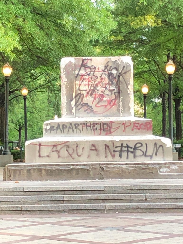 Only the pedestal of the Confederate monument remained Tuesday morning.
