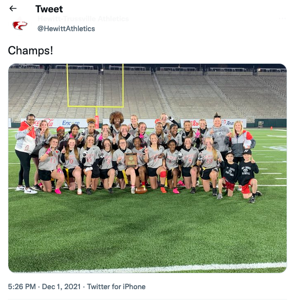 The Alabama High School Athletic Association’s pilot season of girls flag football culminated Wednesday with a championship game between Hewitt-Trussville and Smiths Station high schools at Birmingham’s new Protective Stadium. The Lady Huskies of Hewitt-Trussville defeated the Lady Panthers of Smiths Station in a thrilling overtime game.