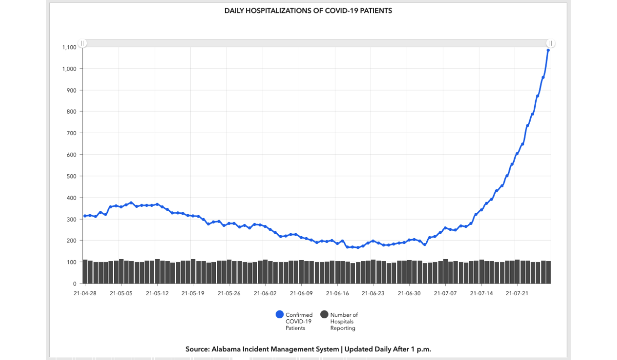 On Tuesday afternoon, Alabama hospitals were caring for more than 1,000 in-patients with COVID-19, up from about 200 at the beginning of July.