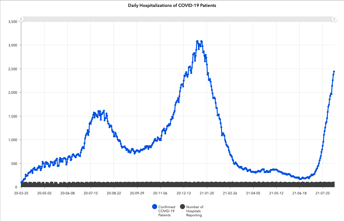 Graph from the Alabama Department of Public Health shows the surge in COVID-19 hospitalizations.