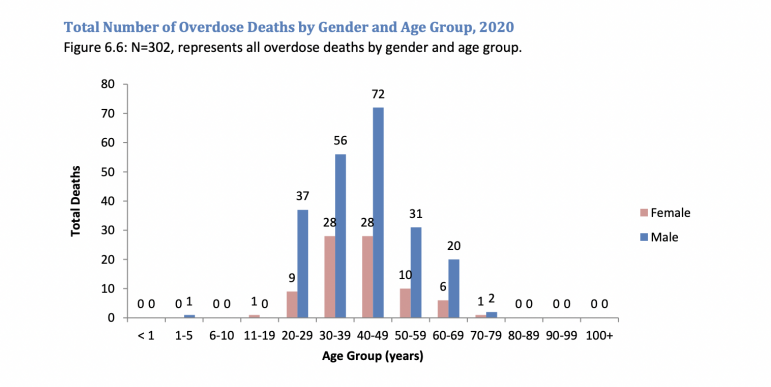 Data from the 2020 county coroner’s report shows a shift in the demographics of overdose deaths, with an increase among Black males and all males in the 40-49 age group. A majority of overdose deaths are among white men.