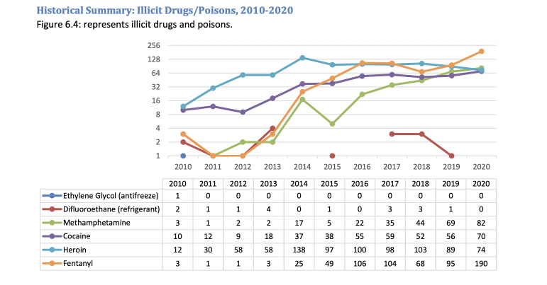 Graph from the Jefferson County Coroner’s Office shows the annual number of overdose deaths due to the most common illicit drugs from 2010-2020.