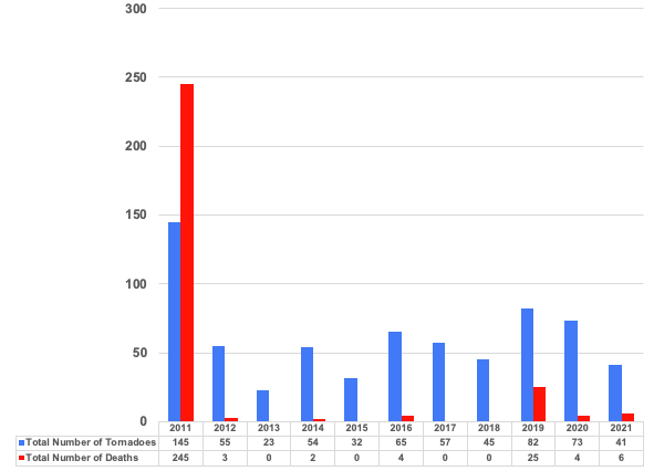 Since 2011, Alabama has recorded 44 deaths from 491 tornadoes. Over that period, Alabama has had almost six times fewer deaths than in 2011, alone. So what has changed?