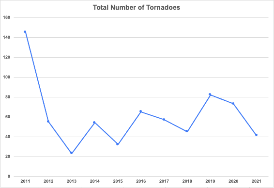In the last 10 years, tornadoes have also been weaker, according to the National Weather Service.