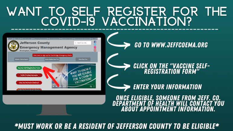 The Jefferson County Department of Health (JCDH) has its own system to register residents for vaccination. If you live or work in the county, you can go online or call 205-858-2221 to ask questions and sign up to receive a vaccine. The hotline is available Monday through Friday, 8 a.m. to 5 p.m.