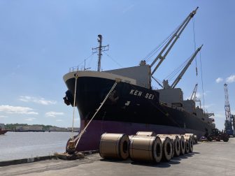 Steel coils sit outside a cargo ship at the Port of Mobile. April 27, 2021.