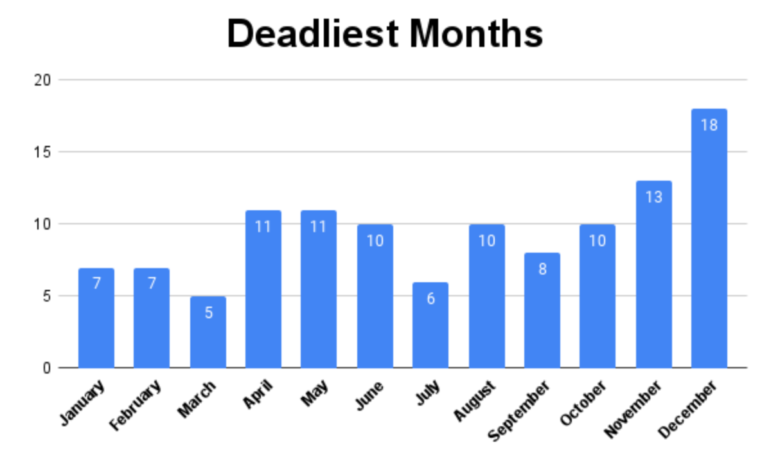 December 2021 marked the deadliest month with 18 homicides. This is on par with 2020, where the city recorded 20 homicides in December, the highest number in a single month for that year.