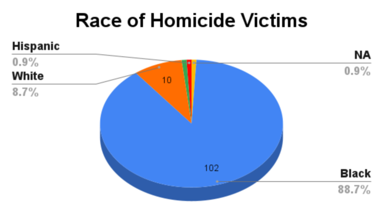 The majority of the homicide cases were male, and roughly 89% of all victims were identified as Black.