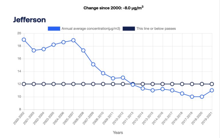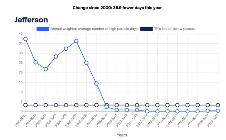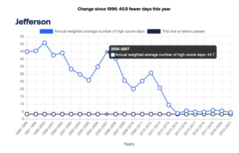 From 2005-2007, Jefferson County saw an annual weighted average number of 44.7 high ozone days, but saw 4.3 days in 2019-2021.