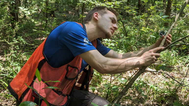 He kneels to the forest floor to measure the tree’s diameter at breast height, a standard measurement taken roughly four and a half feet above the ground. Long then maps the tree’s location, details characteristics about the species and tags the tree.