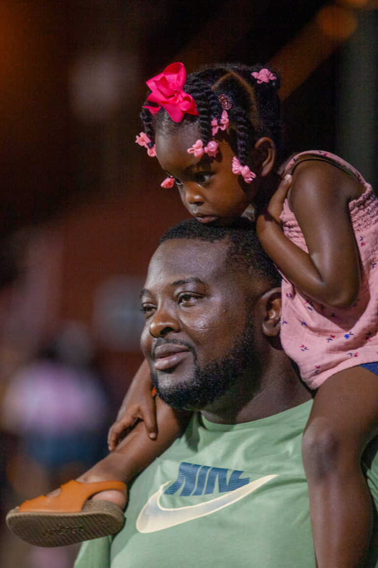 Three-year-old Layla Shepherd is draped over her father Victor’s shoulders as he carries her to their seats to settle in and watch his other daughter cheer. Both of them are shiny with sweat.
