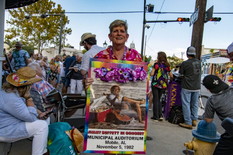 Earlier in the evening, Reed said she’d spoken with a stranger who’d been to the same Jimmy Buffett concert in Mobile that she’d attended more than four decades ago. Reed had brought a poster from the concert to the second line, decorated with island leis at its top. Reed said after they’d talked about the concert, the stranger hugged her neck.