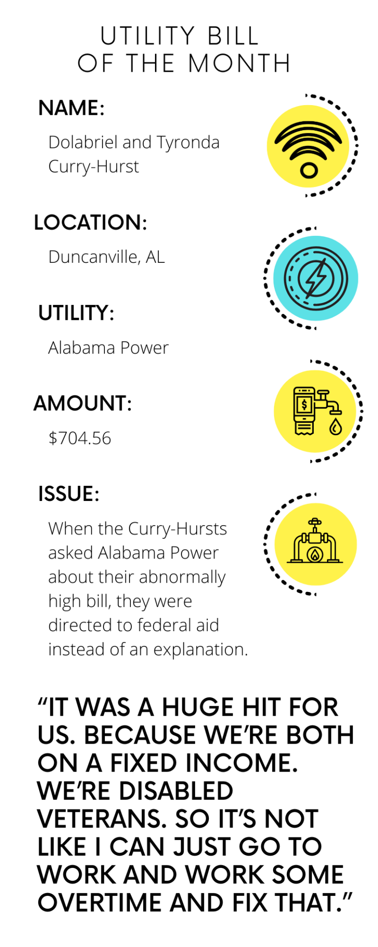 The hope was for Alabama Power to help her understand the reason for the big expense, which Dolabriel Curry-Hurst called a huge financial hit. The family hadn’t changed anything with their lifestyle to explain the jump. If she talked to the company, maybe she’d find out about an appliance that drew too much power, or that someone was illegally siphoning their electricity.