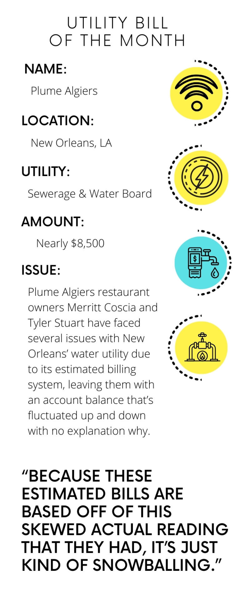 At one point, the New Orleans Sewerage & Water Board (SWBNO), the utility service that manages the city’s water supply, was demanding nearly $8,500 from the small restaurant — an amount Coscia said would put them under. And it’s all because of a practice SWBNO uses called estimated billing.