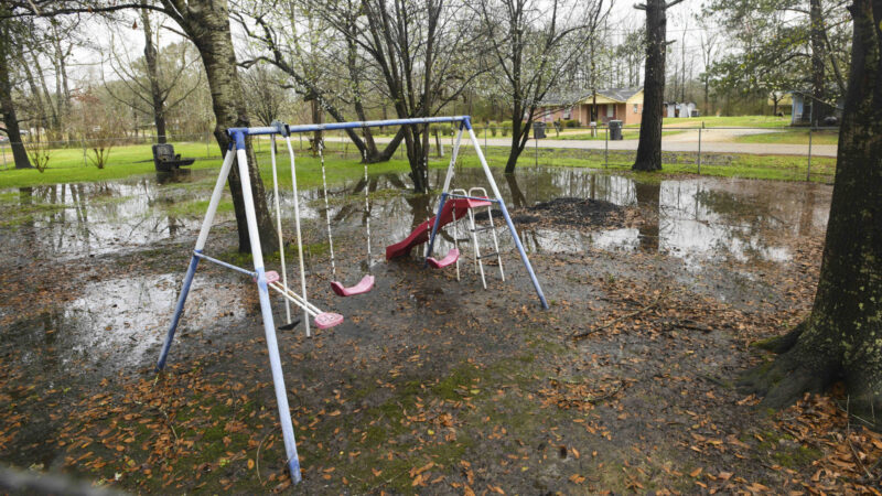In this file photo, heavy rains flood the front yard of Lowndes County resident Charlie Mae Holcombe, Feb. 21, 2019, in Hayneville, Ala. The U.S. Department of Justice on Thursday, May 4, 2023, said an environmental justice probe found Alabama engaged in a pattern of inaction and neglect regarding the risks of raw sewage for residents in the impoverished Alabama county and announced a settlement agreement with the state.