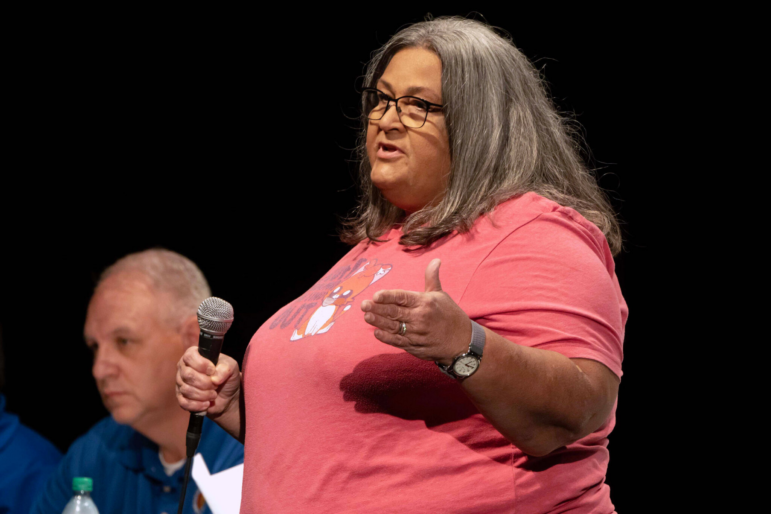 Lisa Lindsay addresses her neighbors in August during the first community meeting since the March explosion. (Lee Hedgepeth/Inside Climate News)