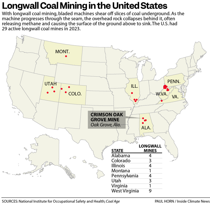 In all, 29 longwall coal mines were operating in nine states as of 2022, according to the National Institute for Occupational Safety and Health. That includes nine in West Virginia, four each in Alabama, Illinois and Pennsylvania and one in Montana. Those numbers and geographic distribution are consistent with a survey published earlier this year by a coal industry publication, Coal Age, which concluded that longwall mining accounted for nearly a quarter of overall coal production in 2023.