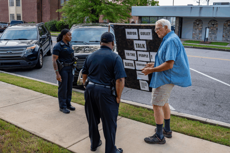 A day prior to the meeting, Bessemer police confronted 80-year-old Marshall Killingsworth outside City Hall, forcing him to remove a sign asking Mayor Kenneth Gulley to meet with him about the data center project.