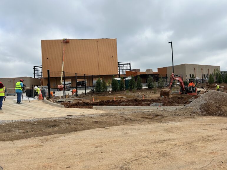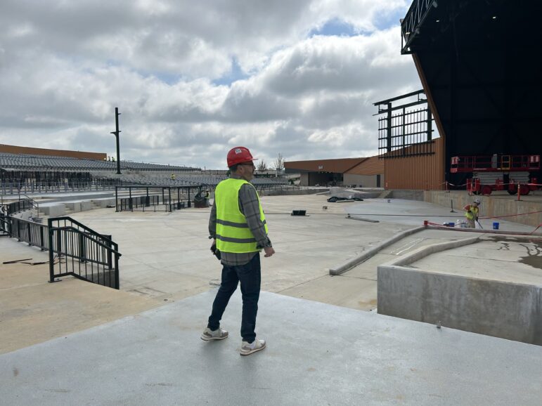 Piles of gravel and other construction materials surround the open air amphitheater, hugged by neighborhood streets and the remains of the Carraway Hospital. But the future loading bay is smooth with freshly laid pavement and construction workers are busily finishing up landscaping and adding the finishing touches to the dressing rooms.