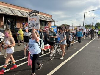 Some participants waved American flags, others wore the flag. Many protesters wore t-shirts mocking Trump. A few donned colonial garb. Many signs emphasized that “no kings” theme of the day. Some signs were painted with crossed out crowns. One read, “1776 called and it wants its tyrant back.”