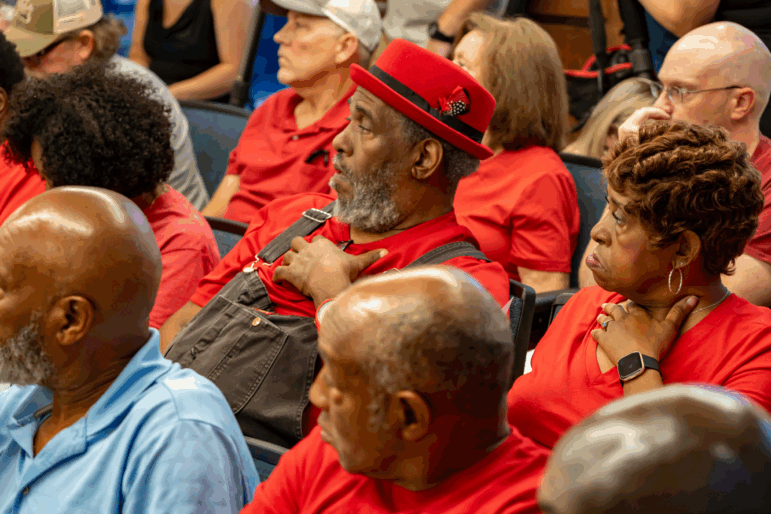 “Y’all just don’t care about the facts,” he said from the side of the room. Residents seated nearby, dressed in red to show their opposition to the data center’s construction, looked shocked.