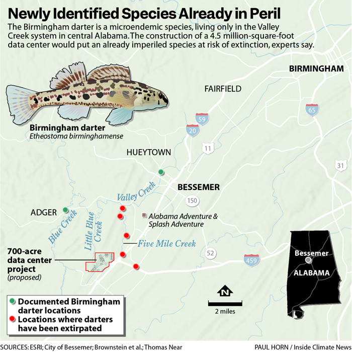 These “dramatic” negative impacts, he said, could include increased river temperature for a fish attuned to inhabit cool, spring-fed streams. Significant water runoff and water extraction for cooling purposes would also fundamentally alter the ecosystem. And Near is concerned about how the data center development might affect the delicate limestone substrate habitat unique to the Birmingham darter.