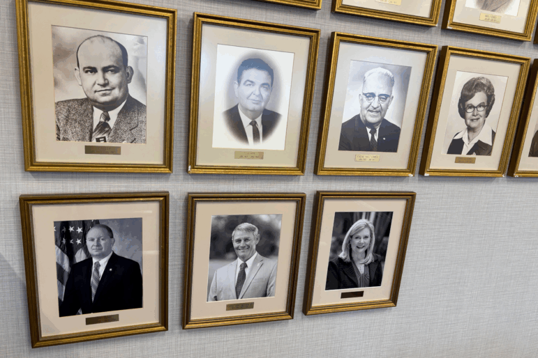 Framed 8-by-10-inch photos of the previous commissioners dating back to 1881 line the wall. The photos are black and white. The commissioners are just white, but that’s not the strange part.