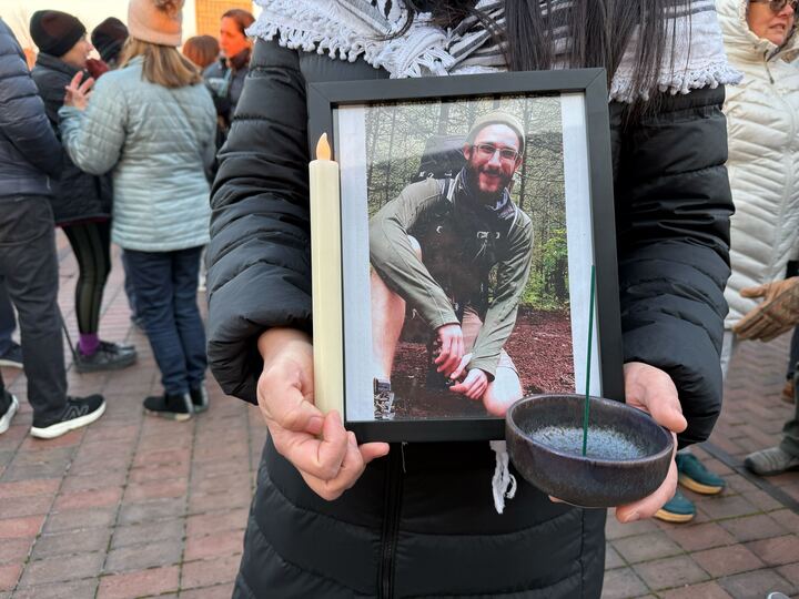 Vigil attendee Haruna Takahashi held up a photo of Pretti. She’s participated in other events by Birmingham Indivisible.